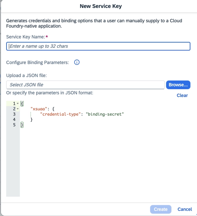 11. Enter a Service Key Name and Credential Type: binding-secret in JSON format.