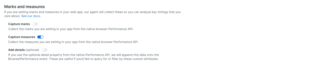 To automatically collect marks, turn on Capture marks. To automatically collect measures, turn on Capture measures. To collect details from observed marks or measures as custom attributes, turn on Add details.